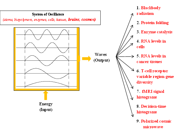 The reason I am interested in the Faraday waves in sessile droplets is because I saw the link between these waves and the waves that I postulated to be induced by energy input in all the material systems in the Universe, from atoms to enzymes, cells, brains, human societies, and to the Universe Itself, depending on the pattern of which the functions of a given system is thought to be determined [3, 4]. This idea is schematically represented in Figure 1 reproduced from [3, 4]: