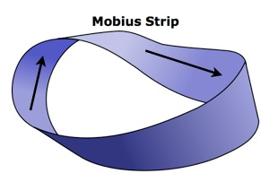 But Statements (3) and (4) are not paradoxical when applied to the Moebius strip shown below, if you label the horizontal arrow with A and the vertical one with B, since, after about 270 ~450 degree circular motions of the artrows on the strip, A will become B and B will become A.