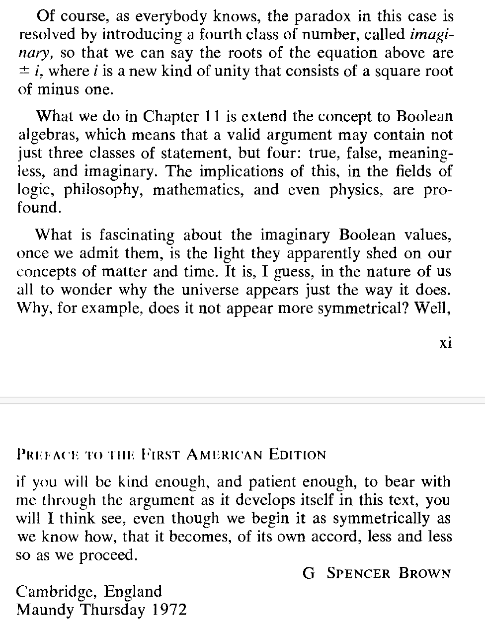 There are many variations. I just discovered that the variation where @@ cancels to the identity ( @@ = ) is a powerful calculus for telling whether certain tangle closures are connected or not connected! Will talk about this next week. This shows that “non-standard logics” are not neccessarily logics at all, but mathematical structures that can be used to see farther into complex situations. GSB liked to talk about the possibilities in using imaginary boolean values. This concept includes extended logics but is subtler than that. In the preface, he suggests comparing the liar paradox to the “paradox” of the square root of negative unity: ii = -1 —> i = -1/i. (If i = 1 then i = -1 and if i = -1 then i = 1).