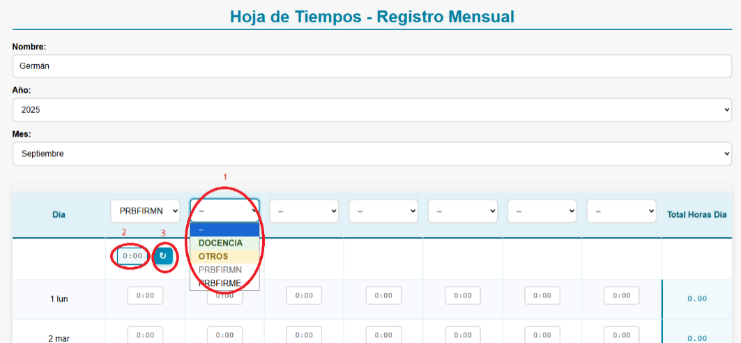 recuadro azul (2) y darle al botón (3) para asignar ese número de horas